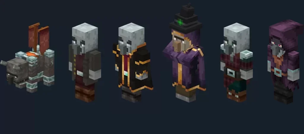- New Weapons and Abilities: Some Illagers are equipped with new weapons and magical abilities. For example, Conjurers can summon magical constructs to attack players, while Beastmasters command hordes of animals to fight on their behalf.